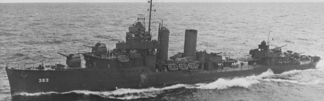 In the war’s first months, Dale performed escort and patrol duties and served with aircraft carriers during some of the fleet’s first counter-blows against the Japanese. She screened Saratoga, CV 3, during the early August 1942 invasion of Guadalcanal and Tulagi and in the Battle of the Eastern Solomons later in the month. In the final months of 1942, following escort service in support of the Guadalcanal Campaign, Dale mainly operated out of Pearl Harbor.