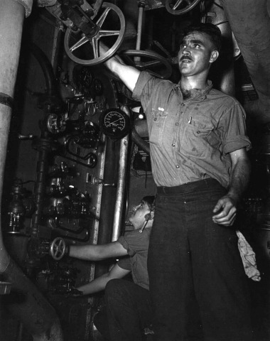 NARA photo 80-G-56051Fire room on board Nicholas, 10 August 1943. Ira D. Allen, WT1/c opens the blower throttle valve of No. 4 boiler while Eben C. Watson, F3/c tends superheater burner.