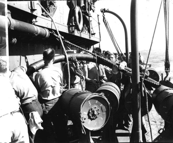 NARA photo 80-G-57657Handing oil hoses on board Nicholas as she refuels from oiler Sabine (AO 25) after the Battle of Kula Gulf, July 1943.