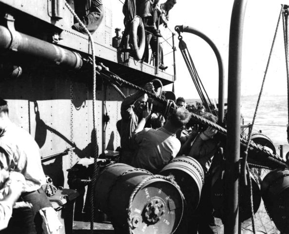 NARA photo 80-G-57659Handing oil hoses on board Nicholas as she refuels from oiler Sabine (AO 25) after the Battle of Kula Gulf, July 1943.