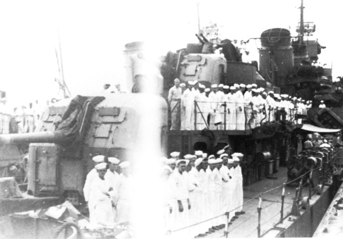 Courtesy C.F. Sutton collection, USS LansdowneForeground: Nicholas with Lansdowne oufboard, prepares to depart the Custom House Pier, Yokohama, with passengers for the surrender ceremony on board Missouri, 2 September 1945.