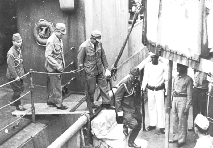 Courtesy C.F. Sutton collection, USS LansdowneJapanese representatives to the surrender ceremony board Lansdowne from Nicholas prior to departing the Custom House Pier, Yokohama, 2 September 1945.