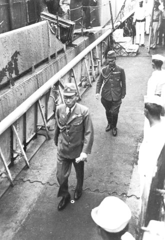 Japanese representatives to the surrender ceremony board Lansdowne from Nicholas prior to departing the Custom House Pier, Yokohama, 2 September 1945.