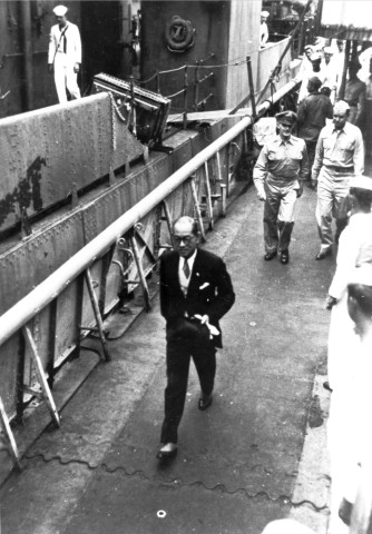 Courtesy C.F. Sutton collection, USS LansdowneJapanese representatives to the surrender ceremony board Lansdowne from Nicholas prior to departing the Custom House Pier, Yokohama, 2 September 1945.