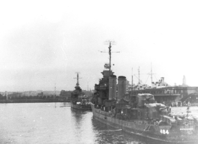 Courtesy C.F. Sutton collection, USS LansdowneNicholas and Buchanan viewed from Lansdowne as Lansdowne backs down from the Custom House Pier, Yokohama, 2 September 1945.