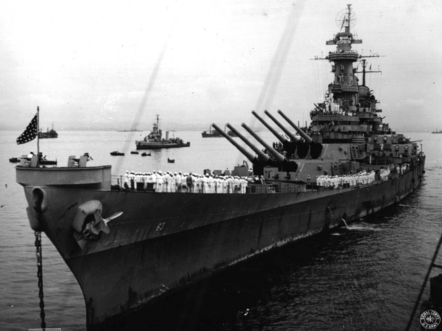 Missouri anchored in Tokyo Bay for the surrender ceremony, surrounded by boats from attending ships and Lansdowne.