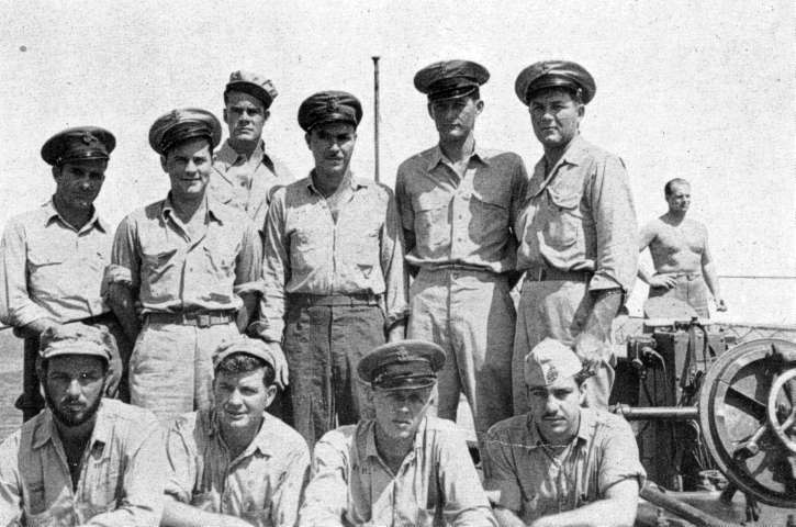 Cruise book, page 18 Chiefs Top: Tartaglia, A. CIM; Unknown; K.R. Nobles, CSM; I.D. (Ira) Allen, CWT; R.T. Enlow, CRT; G.E. Stewart, CMM. Bottom: D.M. Overton, CMM; J.A. Bauer, CWT; W. Raul, CWT; L.S. (“Frenchy”) Latour, CCSTD. Chuck Schermerhorn comment: “My picture was not included with the chiefs. I was in the forward engine room helping put a badly damaged power panel back in working condition.” |