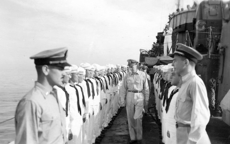 Courtesy R.D. Turpen collectioCruise book, page 30Captain’s Inspection Captain Keith's last inspection! Holland and Sokolski at the ends