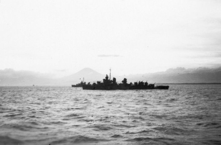Courtesy R.D. Turpen collectionCruise book, page 40Anchored in Sagami Wan — O’Bannon (foreground) and Taylor silhouetted against Mt. Fuji.